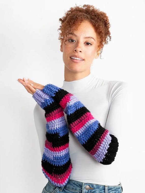Experience the ultimate in cozy comfort with these oversized fingerless crochet gloves, designed to keep your hands snug without sacrificing style. Their plush texture makes them a standout accessory for winter outfits. Perfect for outdoor activities or lounging at home, these gloves are an essential addition to your cold-weather wardrobe. Find the original free pattern on Ravelry.