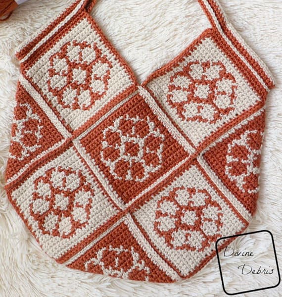 This stylish crochet bag is built from squares with flat floral motifs at the center. The colors shift between dusty terracotta and white, flipping background and flower for visual contrast. Finished with a comfortable handle, it is lightweight, beautiful and ready to go everywhere with you.
