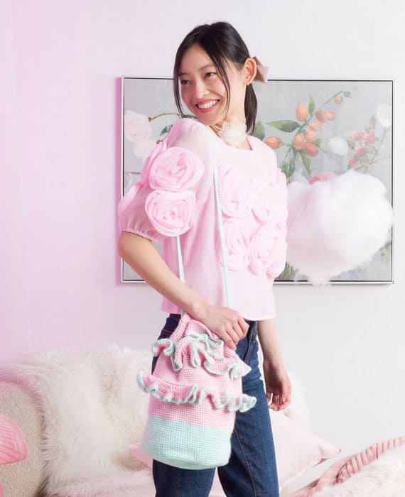 This bold crochet drawstring bag has a serious personality. It’s round in shape, with a turquoise bottom and a bright pink upper part. Two ruffled layers wrap around the pink section like playful waves, and their edges match the turquoise base. A long comfy strap lets you wear it on your shoulder or across the body, making it both fun and functional. PHOTOS by Yarnspirations Design Studio /