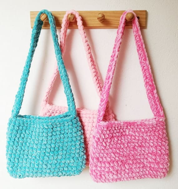 Chunky, velvety yarn turns this crochet shoulder bag into a soft candy-like delight. Crocheted in a simple stitch, its plush texture and squishy shape make it irresistibly cute. Throw it over a coat or a dress – it always works. This bag proves that simplicity and coziness can steal the show.
