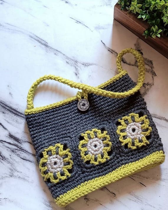 This crochet bag brings together bold color and floral charm in the best way. Dark gray squares form the base, each centered with a cheerful yellow flower and beige core. The same bright yellow-green appears on the handle, bottom, and edging – tying everything together beautifully. It closes with a loop and button for that perfect finishing touch.