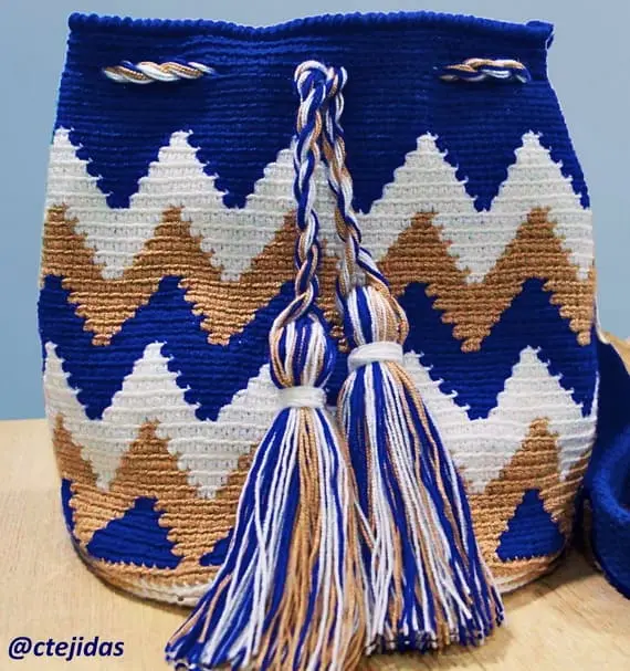 This bold and spacious crochet drawstring bag plays with geometry like a masterpiece. Featuring a wavy zigzag pattern in light brown, white, and electric navy, it’s striking from every angle. The round base mirrors the same motif, while chunky drawstrings in matching colors are finished with oversized pom-poms. A perfect blend of form, function, and statement-making style. PHOTOS by Creaciones