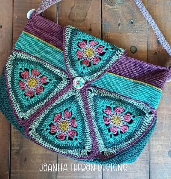 Built from delicate granny triangles with floral centers, this shoulder bag feels like a wearable patchwork garden, full of vibrant greens, deep violets, and rich pinks with sunny yellow middles. Even the flap echoes the design, tying it all together in vintage charm.