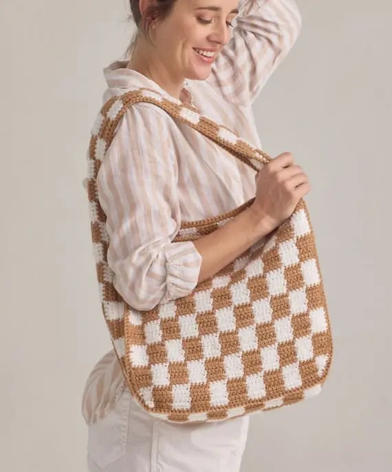 This oversized crocheted shoulder bag is pure visual satisfaction. Imagine a checkerboard pattern in camel and white – but softened by yarn and texture. Spacious, chic, and surprisingly light, it’s ready for books, errands, or just stealing attention wherever it goes.