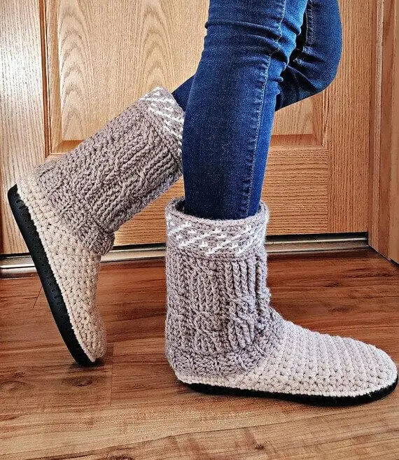 Get ready to cozy up this winter with the Cable Slipper Boots, the ultimate crochet project for both warmth and style! These luxurious boots are crafted seamlessly in one piece, starting right from the Botties Soles and working up to the beautifully ribbed, fold-over cable sweater cuff. The clever cable detailing adds an elegant, textured touch while the sturdy Botties Soles ensure your boots are