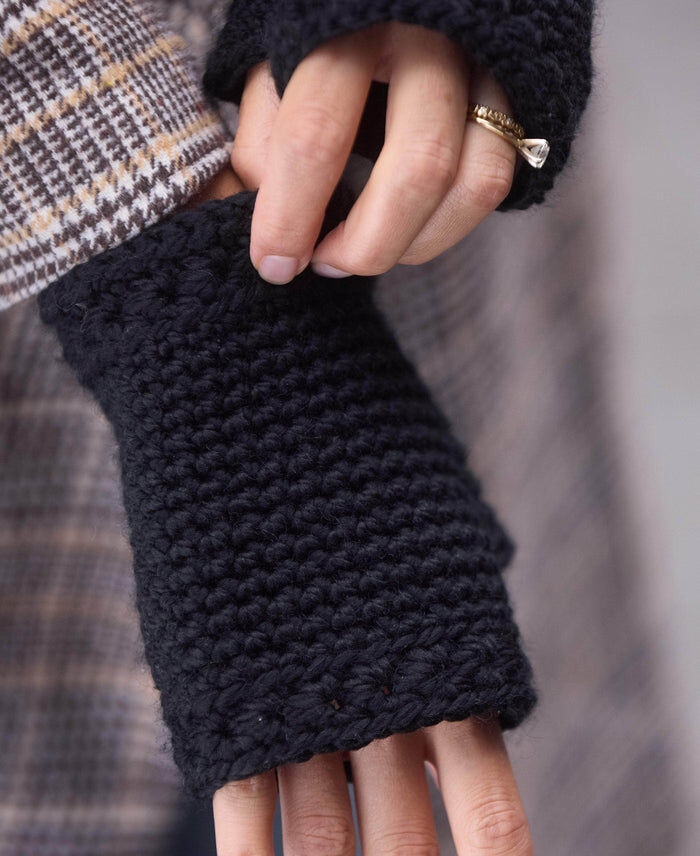 Crafted with this straightforward pattern, these black crochet fingerless gloves offer both functionality and style. Their understated design makes them a versatile choice for any outfit, from casual to formal. Perfect for typing, driving, or staying warm while on the go, they are an indispensable winter accessory. Find the original pattern on premieryarns.com, or read more about it on Ravelry.