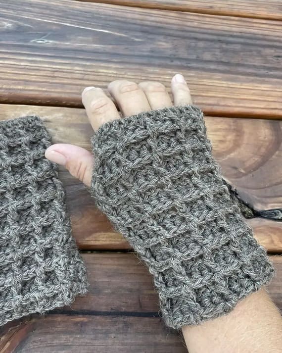 Experience the cozy warmth and texture of these crochet fingerless gloves made with the waffle stitch technique. Their thick, textured design makes them incredibly warm and perfect for cold weather. The volume and intricate design provide both comfort and style, making them a must-have accessory for winter. Find the original free pattern on Ravelry.