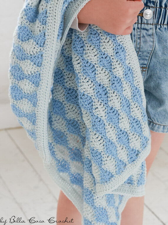 The Little Waves Baby Blanket Free Crochet Pattern features a beautifully textured wavy stitch throughout with gentle undulating rows. Ideal for confident beginners looking to broaden their stitch collection. This blanket uses simple basic stitches in a captivating repeat that is both calming and enjoyable to make. The modern look is finished with a neat, simple border, giving it a sleek and